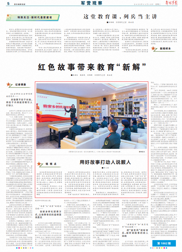 一个好故事,有时胜过一打道理。在信息纷繁复杂的今天,讲好教育中的每一个故事,是新时代部队思想政治教育必须回答好的时代课题。