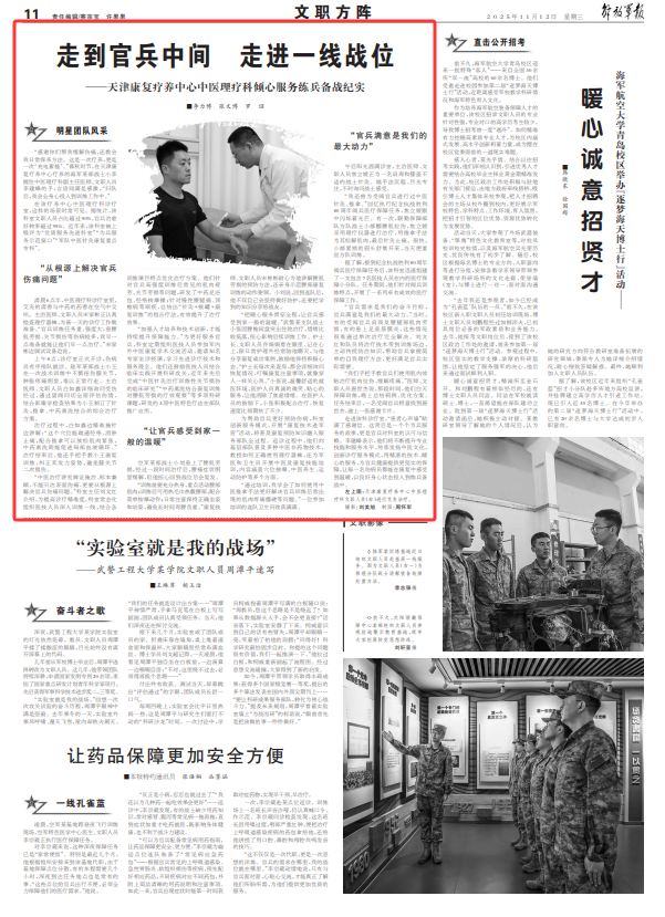“加强人才培养和技术创新,才能持续提升保障能力。”为更好服务官兵,科室定期组织医技人员参加军内外中医康复学术交流活动,邀请知名专家坐诊授课,学习先进诊疗技术和服务理念。他们还鼓励医技人员结合临床实践开展科研攻关,近年来先后完成“中医针灸治疗训练性关节损伤的临床研究”“中药熏洗结合康复训练对腰肌劳损的疗效观察”等多项科研课题,研发的3项中医特色疗法在部队推广应用。