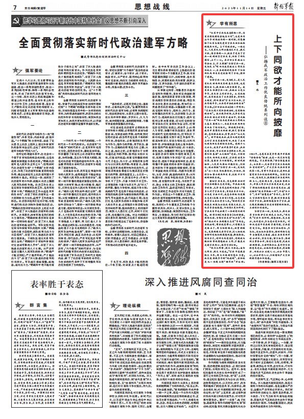 “红军中官兵伕衣着薪饷一样,白军里将校尉饮食起居不同”,这是井冈山斗争时期流传的一副对联,形象描绘了红军与国民党军官兵生活和地位的截然不同。上下同欲者胜。一路走来,人民军队之所以能攻无不克、战无不胜,很重要的一点,就在于建立了官兵一致的新型官兵关系,确保了部队团结、上下一心。在古田全军政治工作会议上,习主席把“坚持官兵一致、发扬民主”明确为我军政治工作优良传统之一,为在新的时代条件下加强部队内部关系建设指明了方向、提供了遵循。