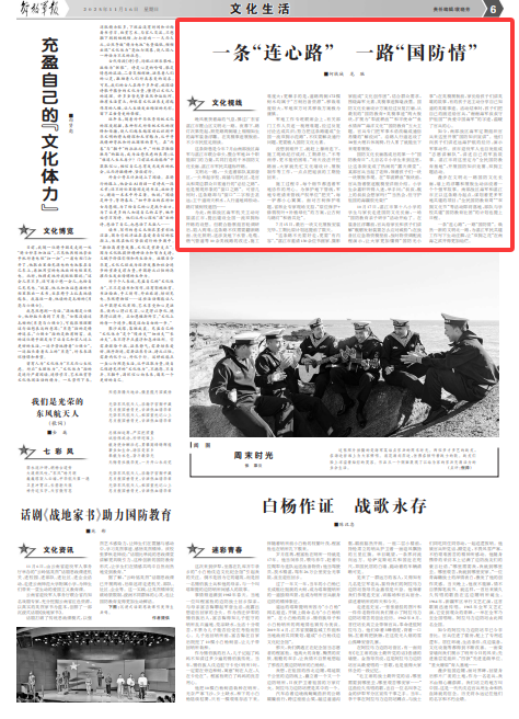 国防文化长廊落成后的第一个“国防教育日”,几百名中小学生来到这里,让这条街变成了热闹的“露天课堂”。某部官兵当起了老师,领着孩子们一块一块展板参观。在“犁波耕浪”板块前,官兵指着驱逐舰模型详细介绍。小学生余嘉轩听得入迷,举手问:“叔叔,舰上的叔叔会想家吗?”“当然会,但守护祖国的海疆很光荣!”