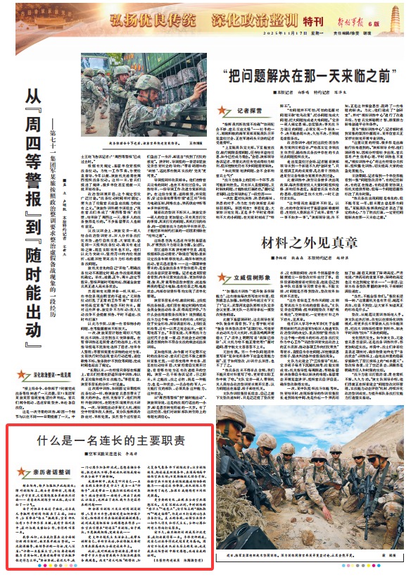 反思辨析中,我反复叩问自己:一名连长的主要职责是什么?是当一名“神枪手”,还是带出一支能打胜仗的过硬集体?政治整训像一面镜子,照出了我的认识偏差,也照出了连队战斗力建设存在的问题——