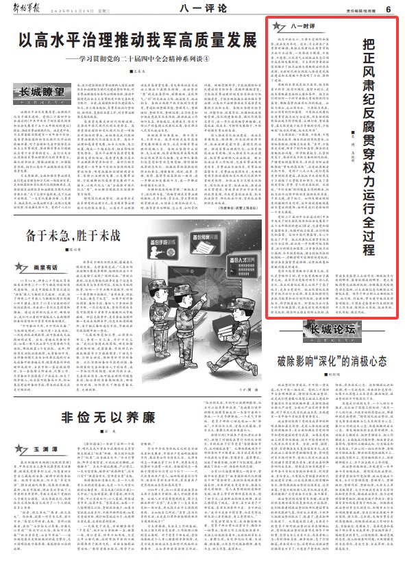 党内不能有腐败分子藏身之地,军队是拿枪杆子的,更不能有腐败分子藏身之地。我军作为党绝对领导下的人民军队,在正风肃纪反腐上必须严于高于地方,走在全党前列。把正风肃纪反腐贯穿权力运行全过程,要求各级持续完善权力配置和运行制约机制,合理分解权力,科学配置权力。盯紧权力运行各个环节加强监督,完善及时发现问题的防范机制、精准纠正偏差的矫正机制,在贯通各类监督上主动作为,确保权力行使到哪里、监督就跟进到哪里。建立腐败预警惩治联动机制,加强廉洁风险隐患动态监测,以大数据信息化赋能正风肃纪反腐。领导干部应树立正确的权力观、地位观、利益观,带头遵守廉洁自律各项规定,习惯在受监督和约束的环境中工作生活,做到公正用权、依法用权、为民用权、廉洁用权。