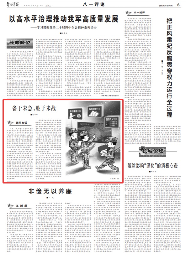 “凡属艰难危险之事,必预筹而布之,务有一定之法,并计不定之法。”我们应坚持底线思维,研究和摸透战场环境、武器装备、作战样式和敌我强弱等方方面面因素,下好先手棋、打好主动仗,做好有针对性的备份。应扎实做好备份手段的训练、备份预案的完善和备份人才的培养,进一步细化作战构想、创新作战方法、完善战法体系,把可能出现的问题想在前,把必要的准备做细做实,确保任何时候、任何情况下都能有备无患、克敌制胜。