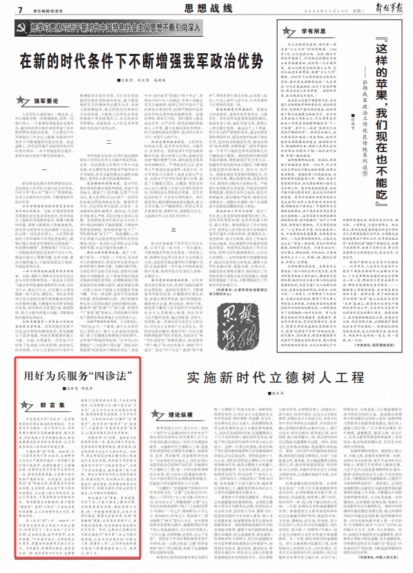 中医望闻问切“四诊法”,是洞察病因进而辨证施治的智慧结晶。为兵服务作为部队一项日常性工作,同样需要以精准化思路破解难题、提升质效,及时发现工作中的堵点痛点,靶向施策解决好官兵的急难愁盼,让为兵服务的初心在实践中落地生根。