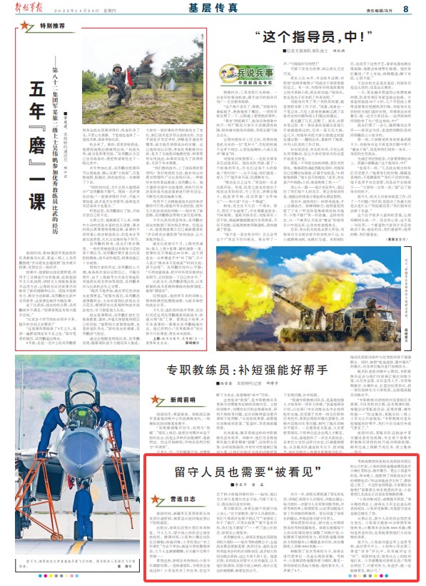 夜里躺在床上,徐班长想起在高原驻训的大部队——每次考核成绩公示,全连战友都会围拢查看、热烈讨论,连队也会利用连务会时机对训练刻苦、进步较大的同志提出表扬,这让大家干劲十足。他意识到,有的战友对留守人员有偏见,认为他们很清闲,而留守战士缺的,或许正是这份被理解、被看见的认可。