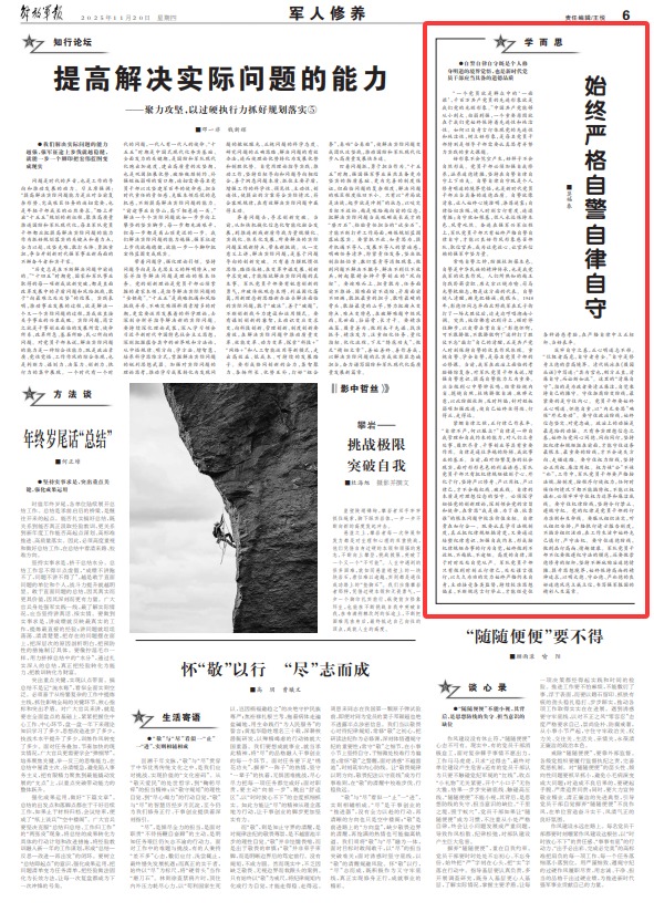 紧绷自律之弦,正行律己作表率。“自律不严,何以服众?”自律是一种自我管理和自我约束的能力,对人们立身处事、履职尽责、干事创业等具有重要作用。自律是通往卓越的阶梯、成就事业的基石。当前,面对纷繁复杂的社会现实,面对形形色色的利益诱惑,军队党员干部只有把纪律规矩铭刻于心、外化于行,坚持严以修身、严以用权、严以律己,才不会越红线、破底线。自律的本质是对理想信念的坚守。必须深学细悟党的创新理论,深刻领会党的宗旨和使命,在常思“我是谁、为了谁、依靠谁”的根本问题中校准价值坐标。自律贵在知行合一。既要认真学习法规制度,真正把纪律规矩搞清楚,又要通过培塑纪律意识、加强自我约束,形成按纪律规矩办事的行为自觉,始终做到不放纵、不越轨、不逾矩。高度的自律,源于时时处处自觉从严。军队党员干部只有做到时刻正行律己,处处谨言慎行,以久久为功的定力始终严格约束自身,主动接受各类监督,持续校准思想偏差,不断规范言行举止,才能经受住各种诱惑考验,在严格自律中立正标杆、当好表率。