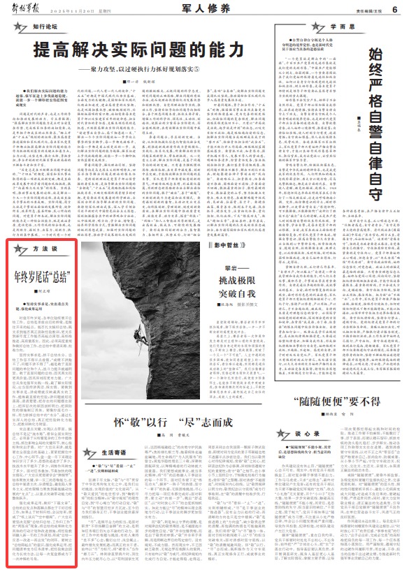 强化成果运用,做好“下篇文章”。总结的出发点和落脚点都在于干好后续工作,如果止于材料归档、会议结束,便成了“纸上谈兵”“空中楼阁”。广大官兵要坚决克服“总结归总结、工作归工作”的“两张皮”现象,将总结的成果转化为具体的行动计划和改进措施,将经验教训融入新一年的工作谋划,形成“总结—反思—改进—再出发”的闭环。要树立“总结即起点”的意识,强化成果运用,把问题清单变为任务清单,把经验做法固化为长效方法,让每一次复盘都成为下一次冲锋的号角。
