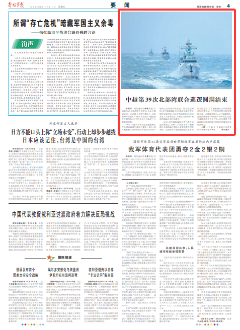 解放军报讯 特约通讯员张彬报道:中越第39次北部湾联合巡逻11月20日圆满结束。此次联合巡逻为期2天,总航程330余海里,中越双方各派出2艘轻型护卫舰参加,中方任务兵力为海军广元舰和阿坝舰。
