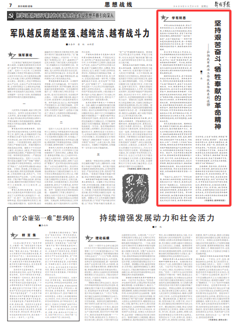 在古田全军政治工作会议上,习主席精辟概括我军在长期实践中形成的“十一个坚持”政治工作优良传统,其中之一就是“坚持艰苦奋斗、牺牲奉献的革命精神”。可以说,艰苦奋斗、牺牲奉献的革命精神不仅是过去我们从胜利走向胜利的重要法宝,更是新征程上履行好新时代使命任务的强大精神支撑。