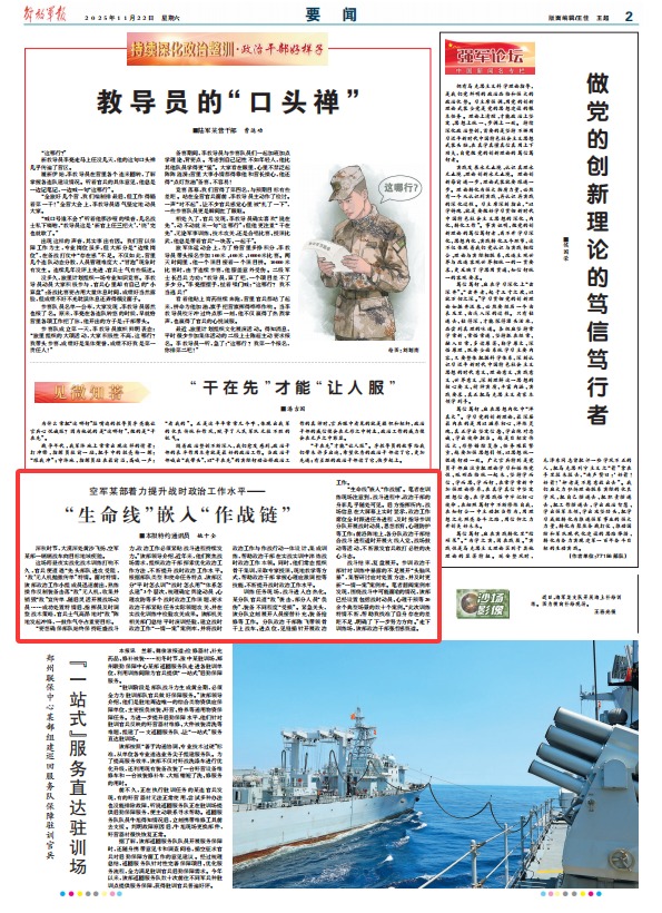 “要想确保部队始终保持旺盛战斗力,政治工作必须紧贴战斗进程持续发力。”该部领导介绍,近年来,他们聚焦战场需求,组织政治干部探索优化政治工作方法,不断提升战时政治工作水平。根据部队类型和使命任务特点,该部区分“平时怎么训”“战时怎么用”“体系怎么建”3个层次,梳理确定舆论动员、心理攻防等多个战时政治工作课题,要求政治干部紧贴任务实际领题攻关,并在实战化训练中检验攻关成果。该部机关相关部门总结平时演训经验,建立战时政治工作“一情一案”案例库,并将战时政治工作与作战行动一体设计、集成训练,帮助政治干部在实战实训中淬炼战时政治工作本领。同时,他们常态组织骨干集训,采取专家授课、现地教学等方式,帮助政治干部掌握心理应激调控等技能,不断提升战时政治工作水平。