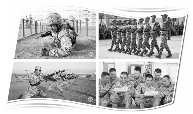 图①:武警内蒙古总队新兵进行战术训练。图②:新兵举行队列会操。图③:新兵进行刺杀训练。图④:新兵们围坐在一起讨论交流。供图:徐 杨 制图:扈 硕