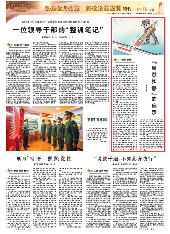 回顾我党我军的奋斗历程,就是一部不忘初心、勇于探索、有错必纠、曲折前进的历史。从新泉整训纠正各种非无产阶级思想,到延安整风运动“反对主观主义以整顿学风、反对宗派主义以整顿党风、反对党八股以整顿文风”……每当重大历史关头、重要历史阶段,我们党都通过政治整训解决突出问题,革除消极因素,在刀口向内的自我纠错中吸取经验教训,使人民军队统一思想、校正方向、整齐队伍,焕发无往不胜的力量。新时代强军征程上,我们更要坚持问题导向、全面纠偏正向,使部队充盈新风正气,不断推动政治整训往深里走、往实里落。
