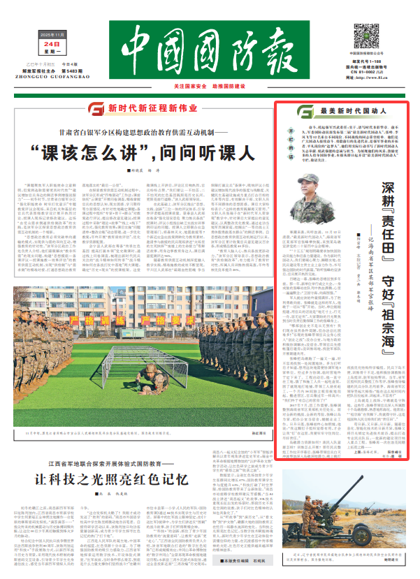 寒潮来袭,风呼浪涌。11月12日清晨,“最美新时代国动人”、海南省军区某部军官张峰乘快艇,来到某岛礁宣讲党的二十届四中全会精神。