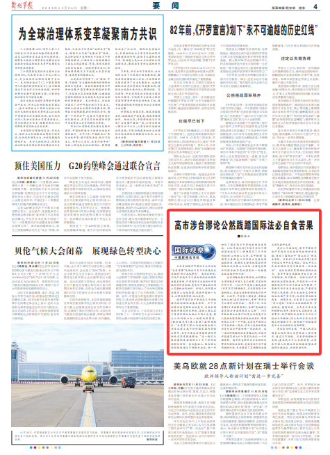 台湾问题纯属中国内政,如何解决台湾问题是中国人自己的事,不容任何外部干涉。1943年中美英三国发表的《开罗宣言》明确规定,日本将窃取于中国的领土,包括台湾和澎湖列岛归还中国。1945年,中美英三国发表、苏联后来加入的《波茨坦公告》,重申“开罗宣言之条件必将实施”。同年9月,日本签署《日本投降条款》,承诺“忠诚履行波茨坦公告各项规定之义务”。1971年联合国大会第2758号决议恢复中华人民共和国在联合国的合法席位,明确世界上只有一个中国,台湾是中国领土不可分割的一部分,中华人民共和国政府是代表全中国的唯一合法政府。这一决议得到国际社会普遍认同,目前与中国建交的183个国家均承认一个中国原则。高市涉台谬论完全无视历史事实与国际法准则,是典型的干涉中国内政的行径,充分暴露了其顽固的右翼立场与挑衅本质。