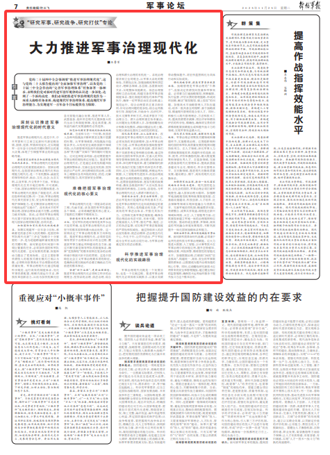 党的二十届四中全会强调要“推进军事治理现代化”,这与党的二十大报告提出的“全面加强军事治理”,以及党的二十届三中全会作出的“完善军事治理体系”任务部署一脉相承,表明我们党对新时代建军治军规律的认识进一步深化,达到了一个新的高度。我们必须把推进军事治理现代化作为一项重大战略任务来抓,构建现代军事治理体系,提高现代军事治理能力,为实现建军一百年奋斗目标提供有力保障。