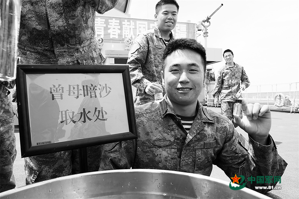 航经祖国最南端的曾母暗沙时,舰领导组织取水活动。严子熠手握装满海水的玻璃瓶,望着眼前的壮丽海天,他默默许下誓言:“我会用实际行动守卫好祖国的蓝色国土!”
