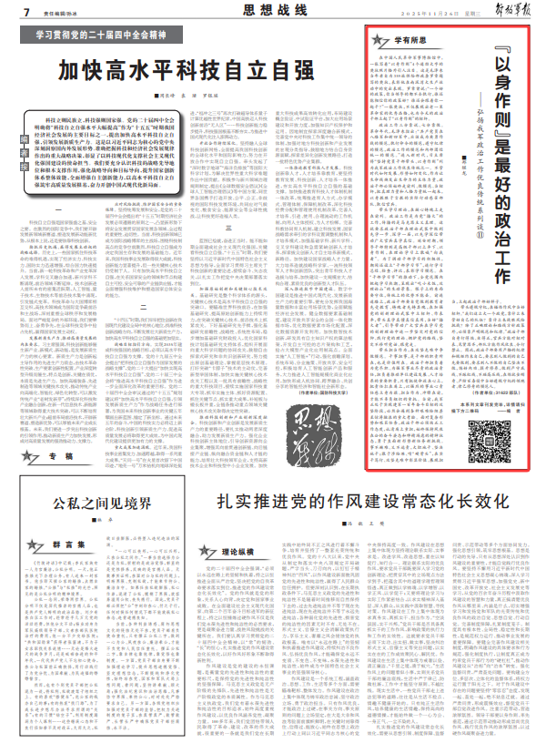 政治工作三分靠说、七分靠做。革命年代,毛泽东指出:“共产党员在八路军和新四军中,应该成为英勇作战的模范,执行命令的模范,遵守纪律的模范,政治工作的模范和内部团结统一的模范。”进入新时代,习主席将“坚持党员干部带头、以身作则”列为我军政治工作优良传统之一。不管时代如何发展、形势如何变化,作为让生命线焕发出生命力的主体力量,政治干部必须始终走前列、做模范、当标杆,把真理力量和人格力量统一起来,以身教胜于言教的实际行动感召部队、取信官兵。