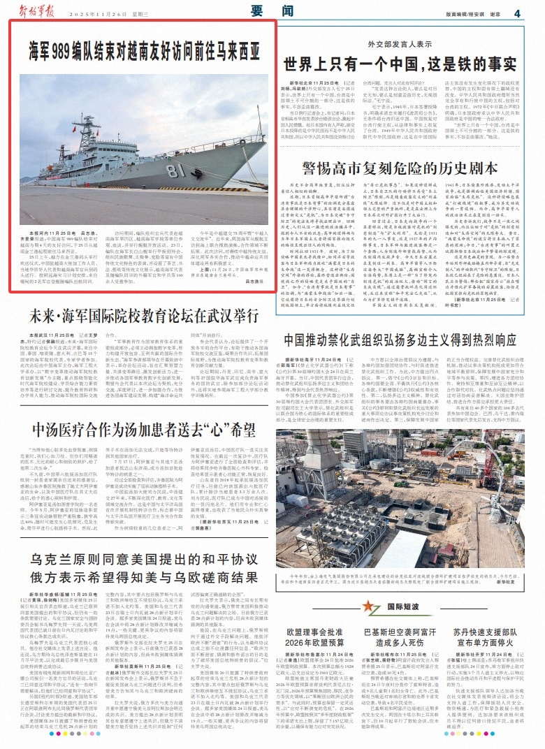 解放军报河内11月25日电 吕志浩、齐呈荣报道:中国海军989编队结束对越南为期4天的友好访问,于25日从越南金兰港起程前往马来西亚。