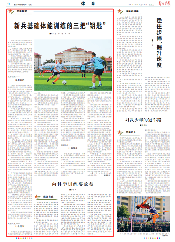 以《军事体育训练大纲》为指引,该基地积极探索科学体训新模式,根据新兵体测情况采取退阶训练、超量恢复、赛训结合的方法,帮助新兵掌握破解体能训练难题的三把“钥匙”。