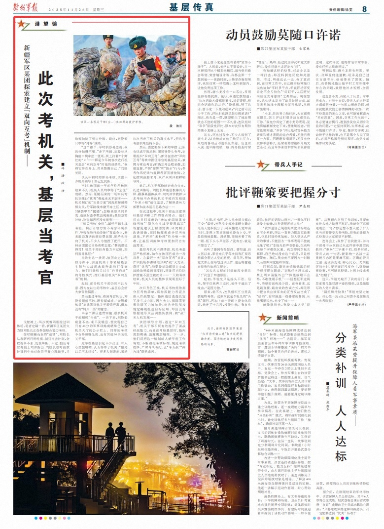 该团领导介绍,通过“双向互考”,机关干部不仅有效提升了谋战研战能力,而且在考核基层时,指向更加明确、出题更加精准。下一步,他们将把这一机制纳入新年度工作筹划,不断细化考核标准、规范考核程序、严肃考风考纪,让“考为战”“练为战”蔚然成风。
