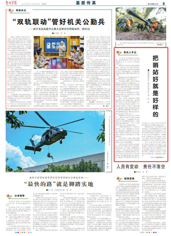 “我就是想把哨站好。”小陈朴实的话语,让我心里既感动又有些自责。感动的是,小陈默默干好工作,很踏实不抱怨;自责的是,自己没有及时走进小陈的内心,倾听他的心声,看到他的努力。