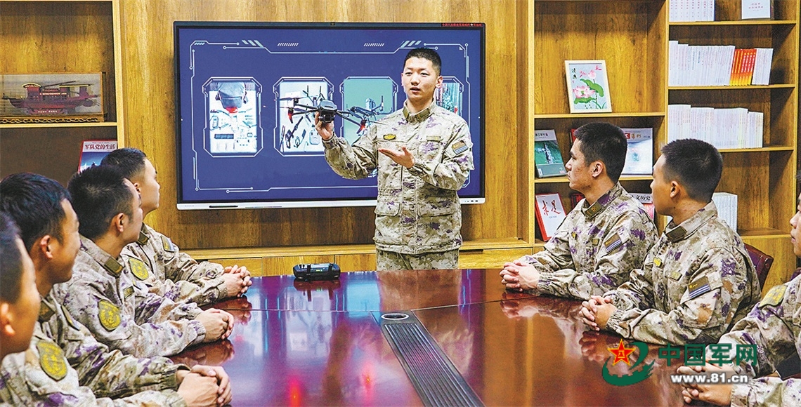 “公勤小课堂”上,负责俱乐部保障的战士正在分享无人机摄影技能。谭 锰摄
