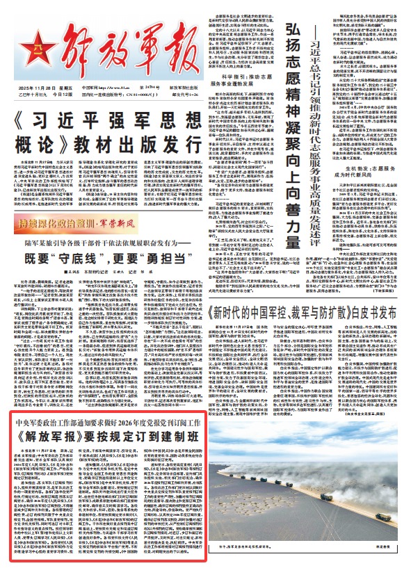 解放军报北京11月27日电 薛涛、记者成文军报道:中央军委政治工作部日前发出通知,要求全军部队认真做好2026年度《人民日报》、《求是》杂志和《解放军报》等报刊订阅工作,严格落实军队《订阅报刊标准》,《解放军报》要按规定订到建制班。