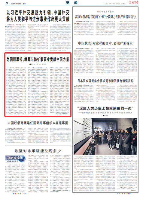 11月27日,中国政府发布《新时代的中国军控、裁军与防扩散》白皮书。这是中国时隔20年后再次以发布白皮书的方式全面阐述军控、裁军与防扩散政策,发出了维护世界和平与安全、携手推进国际军控进程的中国强音。新中国成立以来,中国政府始终坚持和平发展、反对军备竞赛。进入新时代,中国秉持人类命运共同体理念,建设性参与国际军控、裁军与防扩散进程,推动完善全球安全治理,不断为国际军控、裁军与防扩散事业贡献力量。