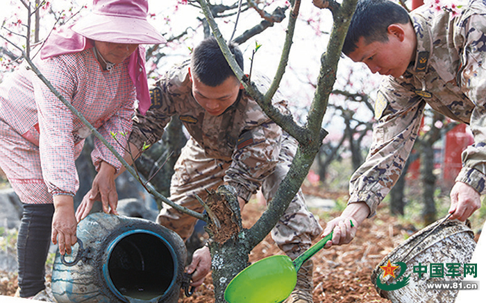 武警贵州总队黔西南支队官兵在普梯村万亩桃林与村民一起栽桃树。李梓良摄