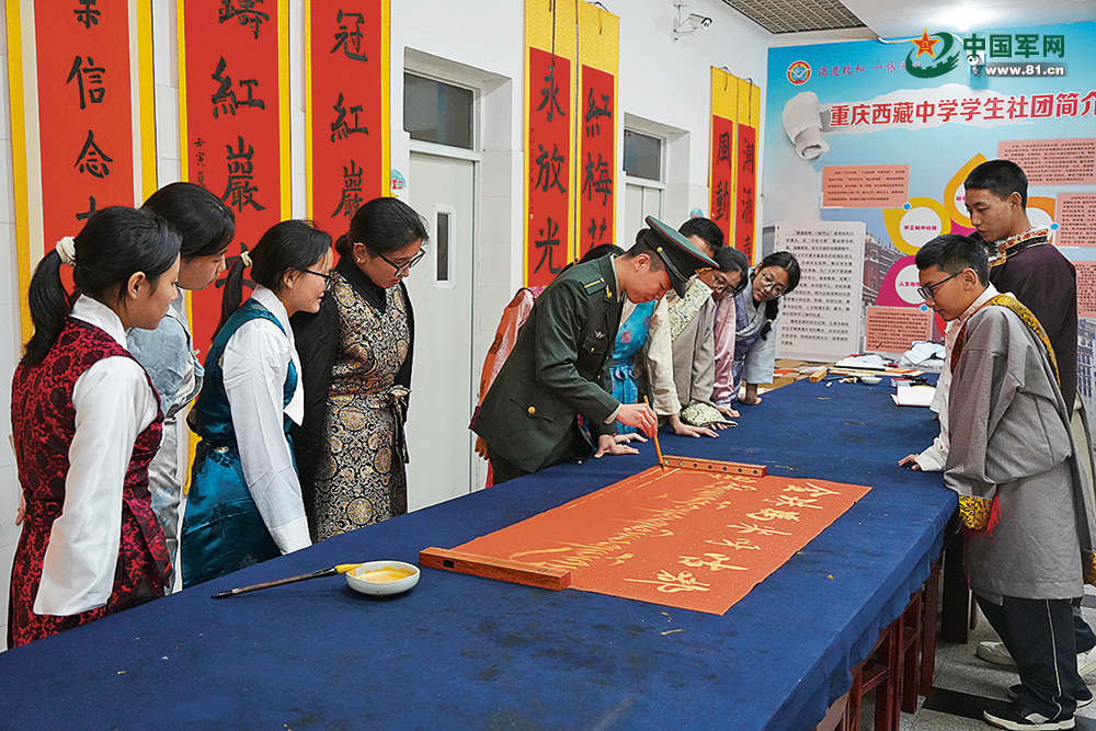 11月6日,信息支援部队工程大学通信士官学校“红岩雪鹰”宣传队队员在重庆西藏中学宣讲后,与师生一起参与学校书法社团活动。 谌世鑫摄