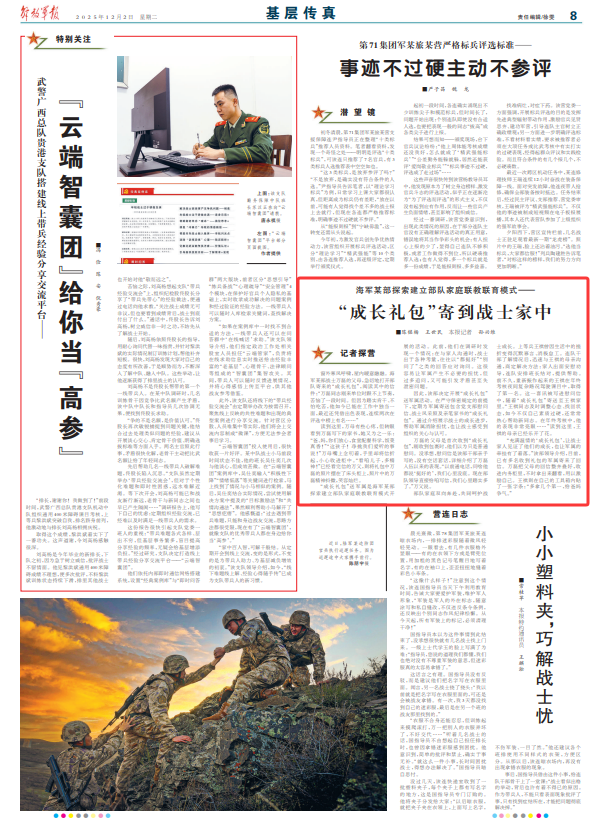 因此,该部决定开展“成长礼包”送军属活动。在严守保密规定的前提下,定期为军属寄送包含党支部慰问信、战士风采照及亲笔家书的“成长礼包”。通过介绍展示战士的成长进步,帮助军属消除担忧,也让战士感受到组织的关心与认可。