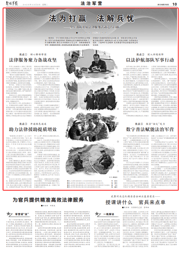 编者按 全军各级党委政法委员会坚持把做好法律服务工作作为深化政治整训、贯彻依法治军战略的重要抓手,作为服务部队、取信官兵的徙木立信之举。各级加强统筹督导、积极解难帮困,持续推动化解部队和官兵反映强烈、影响练兵备战的疑难涉法问题,进一步促进党委依法决策、机关依法指导、部队依法行动、官兵依法履职,为贯彻落实党的二十届四中全会精神、扎实推进军队法治建设奠定坚实基础。