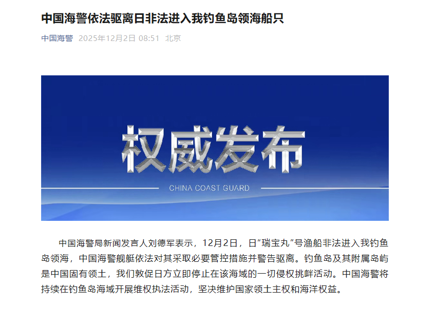 中国海警局新闻发言人刘德军表示,12月2日,日“瑞宝丸”号渔船非法进入我钓鱼岛领海,中国海警舰艇依法对其采取必要管控措施并警告驱离。钓鱼岛及其附属岛屿是中国固有领土,我们敦促日方立即停止在该海域的一切侵权挑衅活动。中国海警将持续在钓鱼岛海域开展维权执法活动,坚决维护国家领土主权和海洋权益。