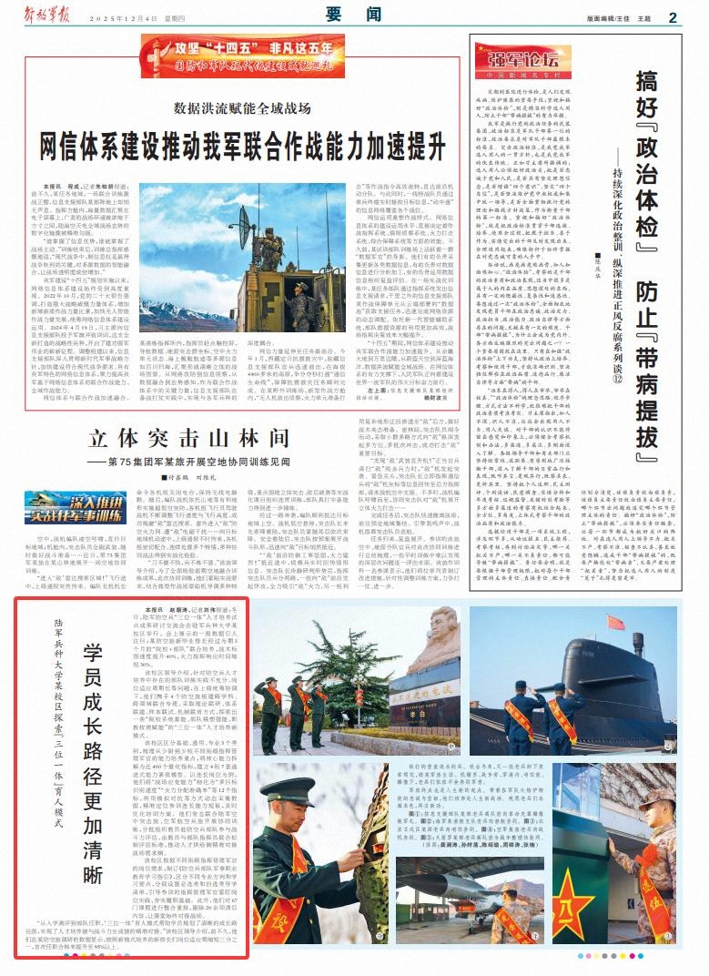 该校区领导介绍,针对防空兵人才培养中存在的部队训练实践不充分、岗位适应周期长等问题,在上级统筹协调下,他们携手4个防空旅组建跨学科、跨领域联合专班,采取理论联研、体系联建、样本联试、机制联育方式,探索出一条“院校系统蓄能、部队精塑强能、职教按需赋能”的“三位一体”人才培养新模式。