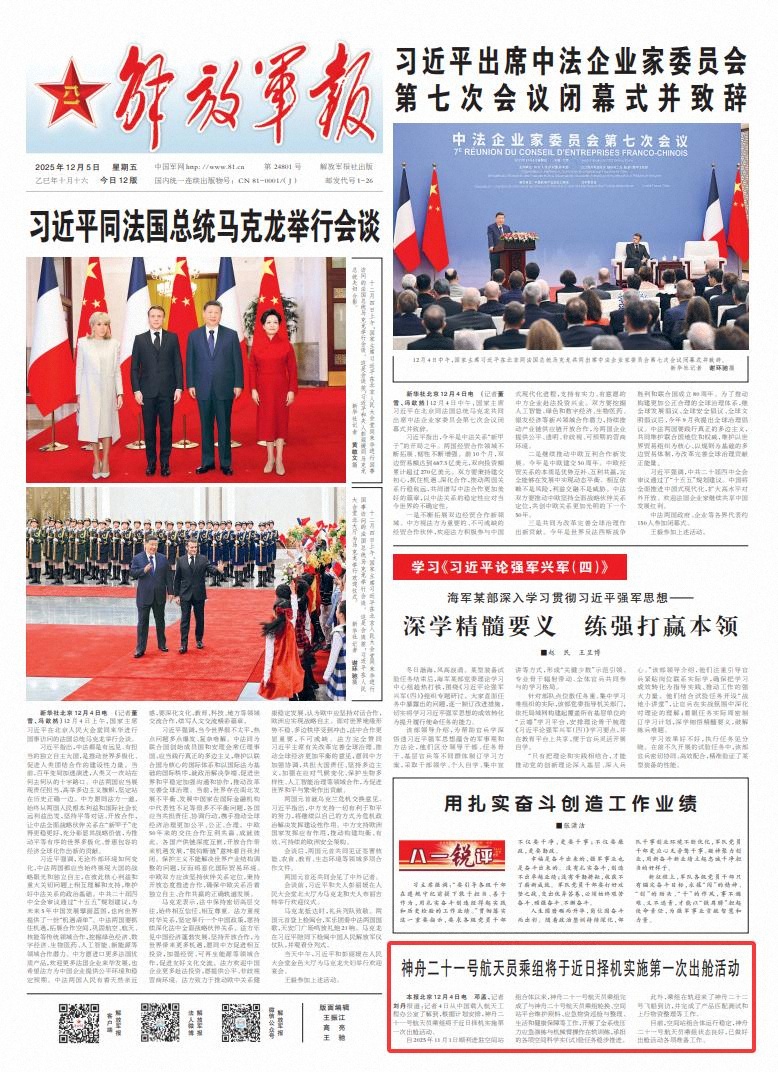 解放军报北京12月4日电 邓孟、记者刘丹报道:记者4日从中国载人航天工程办公室了解到,根据计划安排,神舟二十一号航天员乘组将于近日择机实施第一次出舱活动。