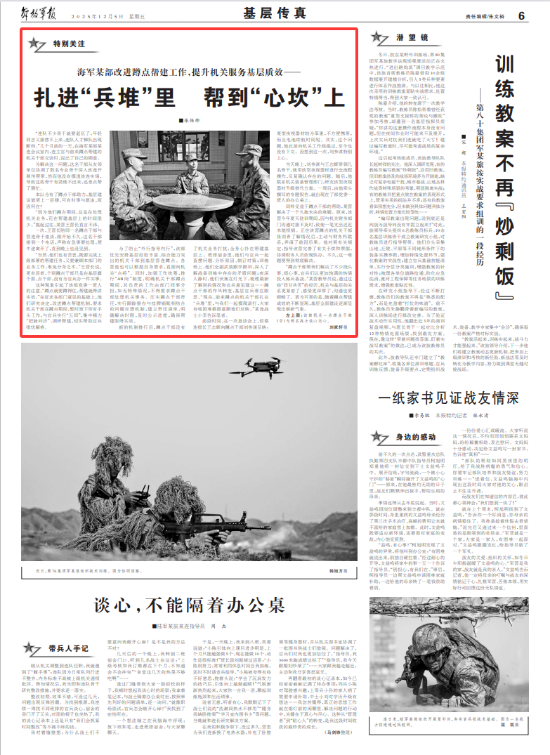 这种现象引起了该部党委一班人的注意。“蹲点就要蹲得住,帮建就得讲实效。”在征求各部门意见的基础上,他们研究决定,改进蹲点帮建机制,要求机关干部在蹲点期间,暂时放下所有手头工作,与官兵实行“五同”,集中精力“把脉问诊”、调研帮建,切实帮助官兵排忧解难。