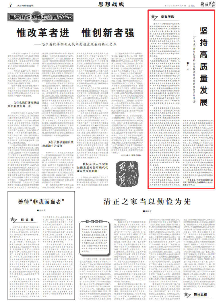 党的二十大明确提出“高质量发展是全面建设社会主义现代化国家的首要任务”的科学论断,对新时代新征程党的中心任务、首要任务、重大原则、战略举措等作出明确阐释和系统部署。党的二十届四中全会审议通过《中共中央关于制定国民经济和社会发展第十五个五年规划的建议》,与“十四五”规划一脉相承,把坚持高质量发展确定为“十五五”时期经济社会发展必须遵循的原则之一,体现了中国式现代化与时俱进的时代品格,对于中国式现代化行稳致远具有十分重要的意义。