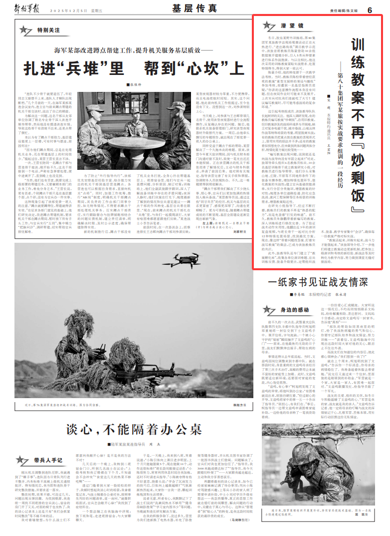 在研究小组指导下,经过不断打磨,教练员们的教案不再是“熟悉的配方”,而是充盈着“打仗的味道”。前不久,教练员朱静鹏带着新编写的教案,深入训练场进行修改完善。为了验证战术动作实用性,他翻出近3年的演训复盘视频,与班长骨干一起对比分析12种特情处置场景,找到最优方案。现在,像这样“带着问题找答案、盯着实战写教案”的做法,已成为该旅教练员的共识。