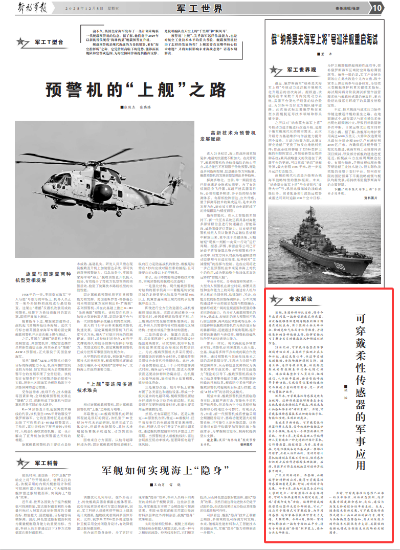 近年来,可穿戴柔性传感器走进大众视野。这种传感器能够附着在士兵皮肤表面或者缝制在军服上,构成未来士兵感知体系的“神经末梢”。当前,可穿戴柔性传感器技术正加速向数字化、智能化演进,呈现出新亮点。