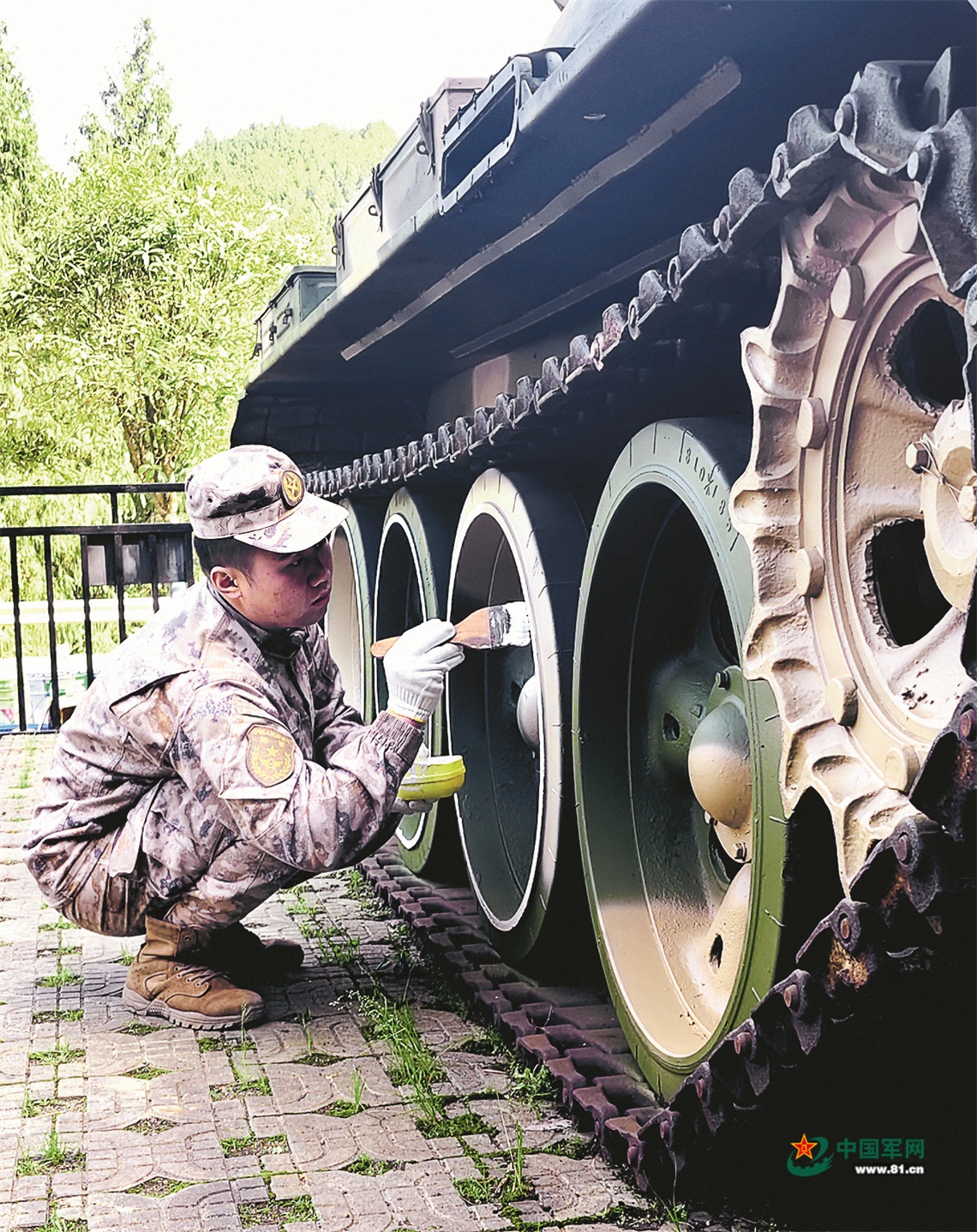 修缮过程中,官兵按照装备维护标准,对涂装工艺精益求精。一丝不苟除锈打磨,反复比对、精准调配漆料,对坦克轮毂螺丝进行规范补色……“用专长为英雄故乡做点力所能及的事,让更多参观者欣赏到状态良好的装备展陈,我们感到很光荣。英雄的精神同样激励着我们,在装备维修保障任务中更加细致严谨,确保每一件装备都处于最佳状态。”该保障队一级上士雷英豪说。