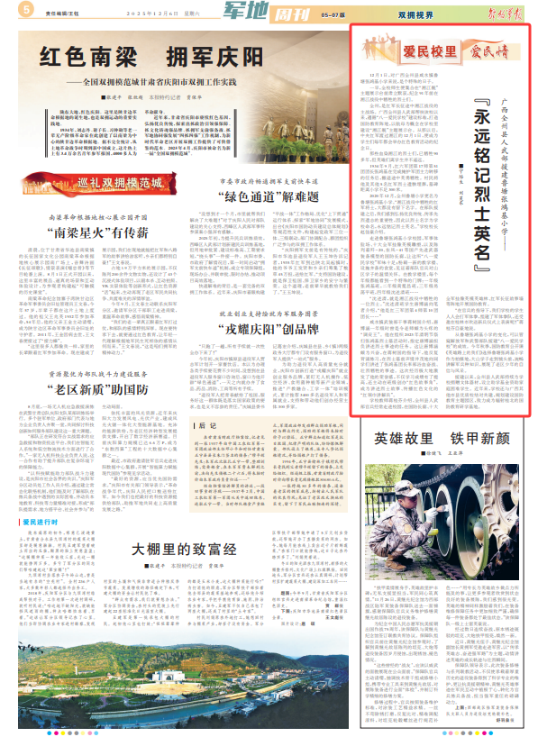 全州,是红军长征途中湘江战役的主战场。广西全州县人武部帮扶该校以来,遵循“八一爱民学校”建设标准,打造国防教育阵地,以航母为概念在学校里建设“湘江舰”主题展示台。从那以后,中央红军渡过湘江的12月1日,便成为学生们每年都会举办红色教育活动的纪念日。