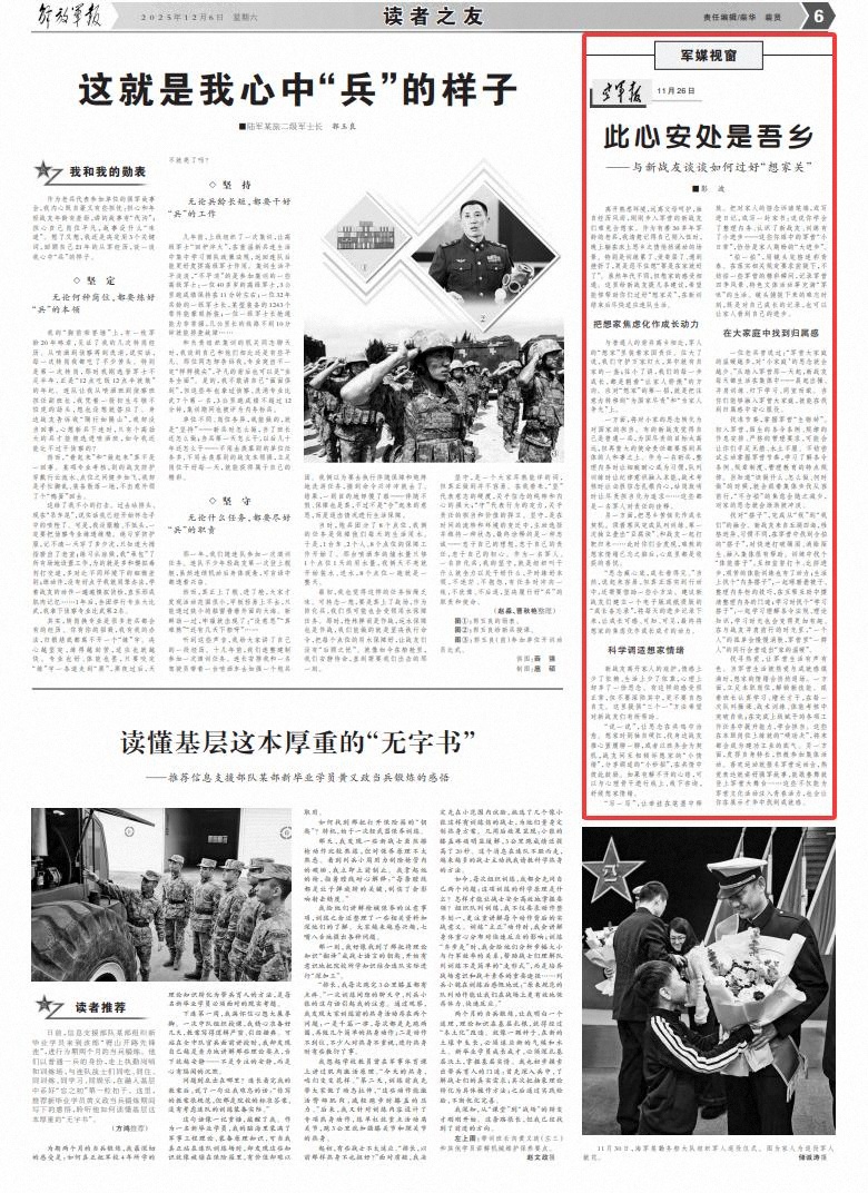 与普通人的背井离乡相比,军人的“想家”里装着家国责任。往大了说,我们守护万家灯火,其中就有自家的一盏;往小了讲,我们的每一步成长,都是朝着“让家人骄傲”的方向。应对“想家”的第一招,就是把注意力转移到“为国家尽责”和“为家人争光”上。