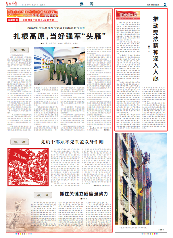 12月4日是第十二个国家宪法日,12月1日至7日是今年全国“宪法宣传周”。宪法是全面依法治国的总依据,也是依法治军的总依据。巩固国防,抵抗侵略,保卫祖国,保卫人民的和平劳动,参加国家建设事业,努力为人民服务,是宪法赋予人民军队的神圣职责。广大官兵享有宪法和法律赋予的权利,也必须履行宪法和法律规定的义务和神圣使命。