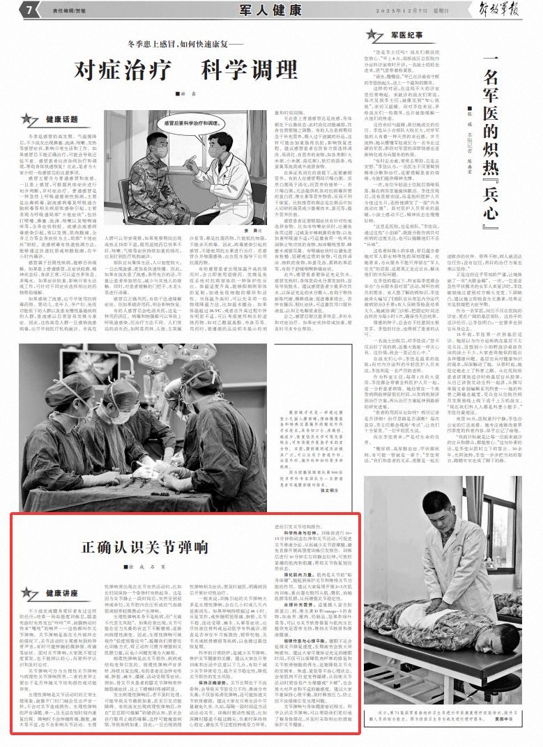 不少战友或健身爱好者有过这样的经历:结束一场高强度训练后,膝盖弯曲时突然发出“咔咔”声、肩膀转动时传来“嘎吱”的响声……这些都叫作关节弹响。关节弹响是指在无外部冲击的情况下,关节活动时主观感知到的异常声音,有时可能伴随轻微肿胀、疼痛等症状。面对关节弹响,大家既不要过度紧张,也不能掉以轻心,而要科学认识和及时应对。