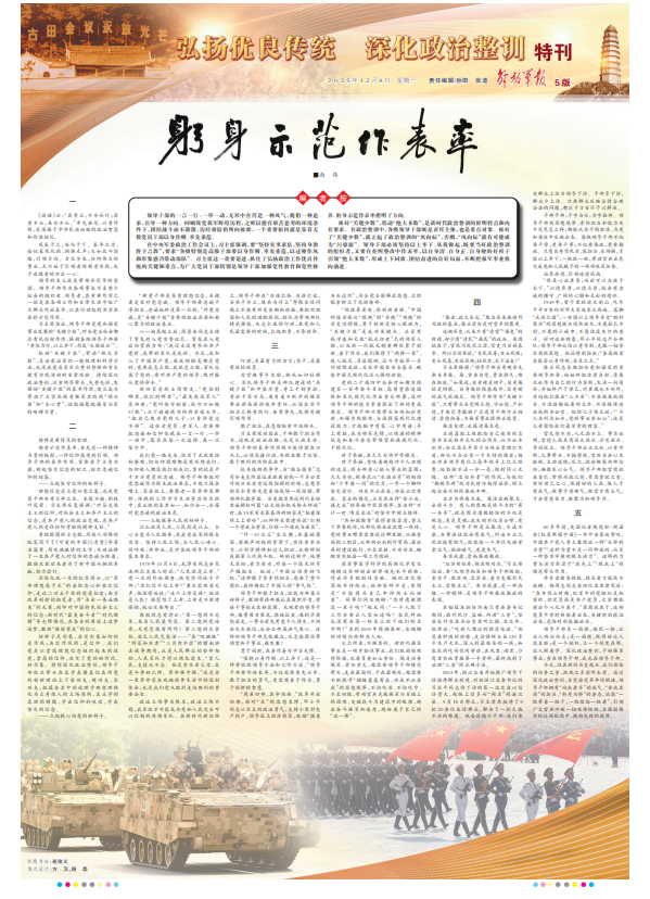 今天,站在新的历史起点,我们面临的任务之重、挑战之多前所未有。通过深化政治整训,自觉接受革命性锻造,领导干部拥有“向我看齐”的底气、“舍我其谁”的担当、“躬身为桥”的姿态,就能“一级带着一级干,一级做给一级看”,引领广大官兵冲破一切艰难险阻,在强国强军的壮阔航程中,驶向光辉的彼岸。