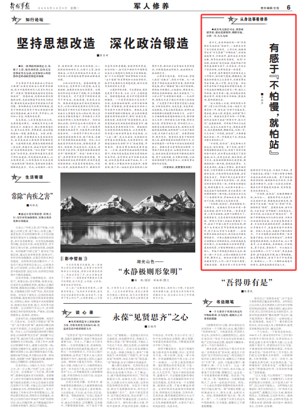 前不久,在某部组织的一场“优秀排长交流访谈”活动中,一名排长分享了自己的成长经历。工作之初,他被领导认为“不太靠谱”“不够托底”,后来他奋起努力、不断进步,最终成长为官兵信服、领导信任的优秀排长。他用“不怕慢,就怕站”这句俗语,寄语年轻干部要在基层埋头苦干、扎实成长,引发台下官兵共鸣,也带给笔者一些思考。