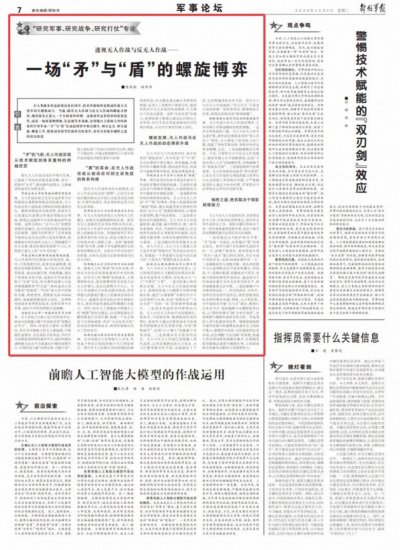 无人与反无人作战的对抗,绝非简单的“猫鼠游戏”,其本质是“矛”与“盾”在动态博弈中相互催生、相互超越,在激烈对抗中螺旋发展,推动战争形态、技战术与战略思维向更高、更复杂维度演进。