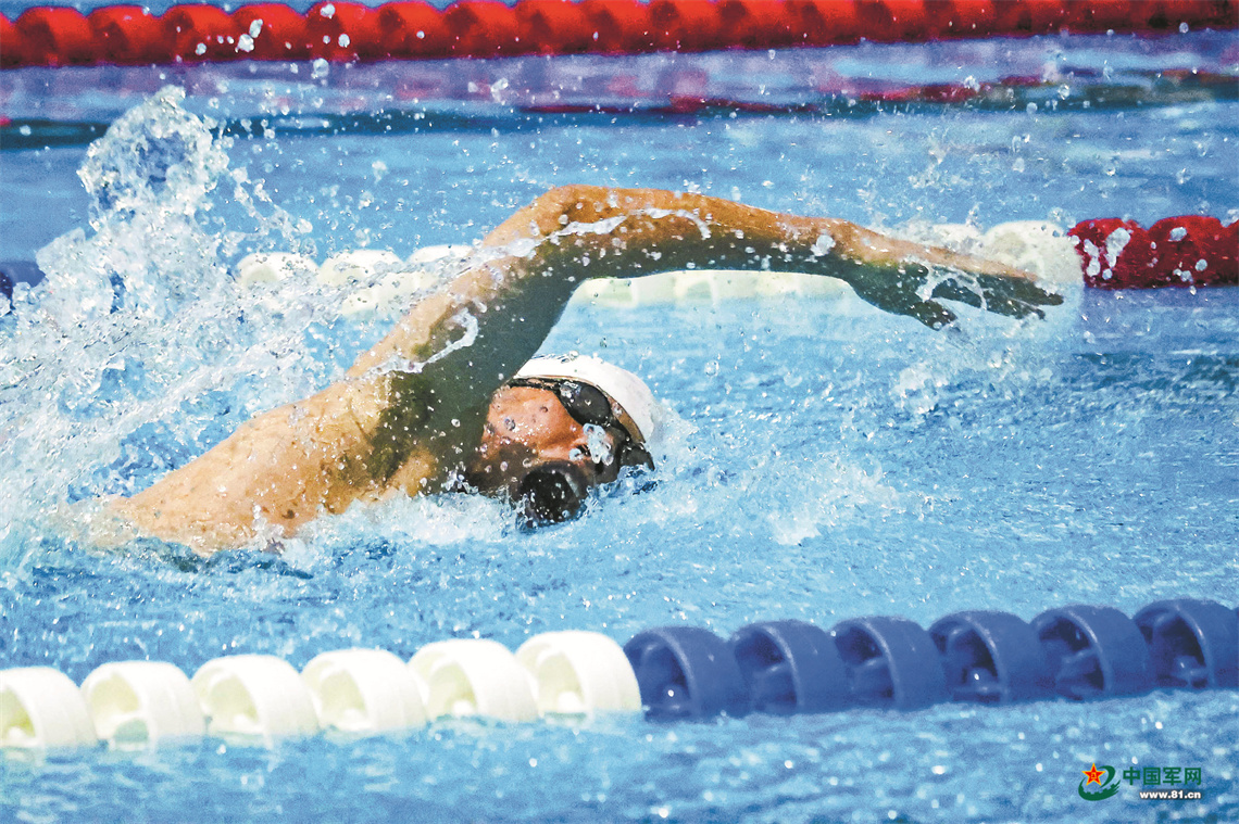 游泳馆内,喝彩声一浪高过一浪。大三学员邓哲元身姿矫健、劈波斩浪。刚和队友一起夺得男子4×100米蛙泳接力冠军的他,休息片刻后又参加男子50米蛙泳比赛。蹬腿发力、稳定节奏、全力冲刺……碧波翻腾的泳道上,邓哲元以34秒03的成绩夺冠,并且刷新了该项目的校运会纪录。在本届军体运动会上,他还摘得男子50米自由泳金牌。