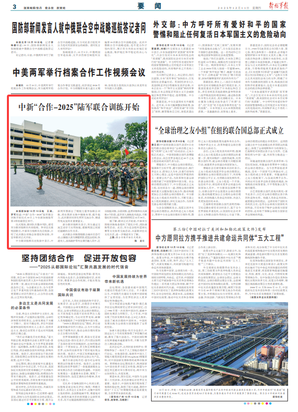 解放军报新加坡12月10日电 王涵、罗可报道:中新“合作-2025”陆军联合训练开始仪式10日上午在新加坡陆军第3师裕廊营区举行。
