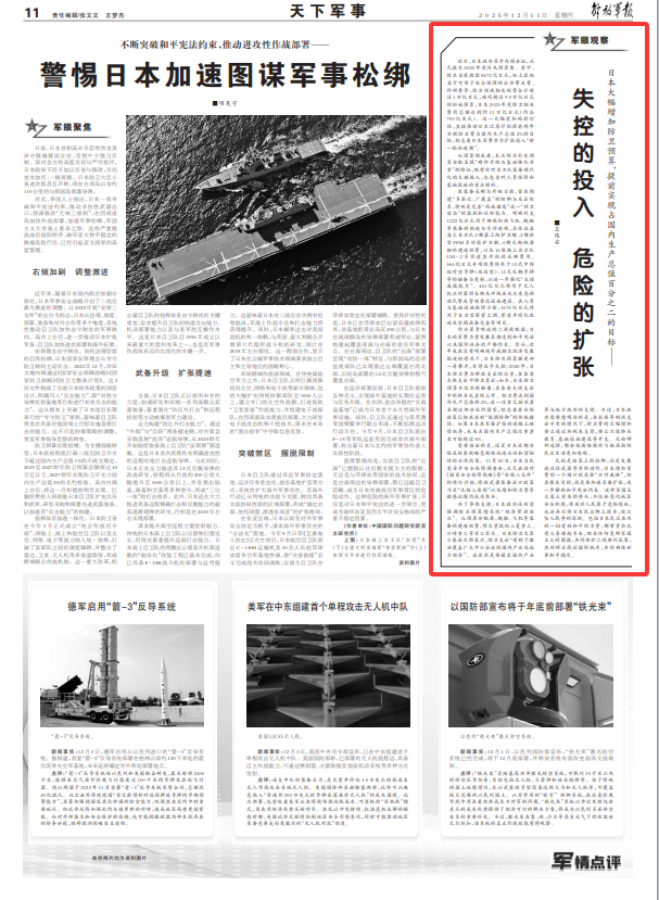 无论是政策上的松绑,还是发展进攻性武器等实际动作,日本增加军费的一个借口就是要“应对威胁”,但其根本目的,就是要加速军备扩张,进一步摆脱和平宪法约束。这种军国主义卷土重来的势头,不仅会恶化地区安全环境,将亚洲人民置于危险境地,也会再次将日本民众绑上战车,使之坠入战争的深渊。包括日本民众在内的一切爱好和平的力量,都有责任也有义务携起手来,阻击任何复辟军国主义的图谋,共同维护二战胜利成果,共同捍卫战后国际秩序,共同确保世界和平稳定。